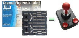 Mit ein wenig Tüftelei waren alsbald ein Druckerkabel angepaßt und ein Joystick zerlegt, sowie eine kleine Transistorschaltung auf der Kosmos-Platine zusammengesteckt.